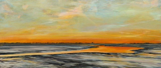 I have two styles of painting I fluctuate between. Realism (which is my background) and Expressive semi-Abstract. My practice is filled with exploring to see what resonates with me. Sometimes I enjoy making energetic marks, painting intuitively and follow what the painting tells me. Other times, I feed my soul more quietly. I like the challenge of recreating the color in a sunset, emulate the stillness in the sky or play with reflection. I love taking in the beauty that surrounds us here and to paint it well will be my forever passion.